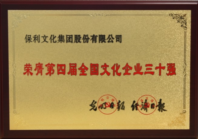 保利文化集團(tuán)股份有限公司2004年被文化部命名為“文化產(chǎn)業(yè)示范基地”;2011年被文化部授予“十大最具影響力國(guó)家文化產(chǎn)業(yè)示范基地”稱號(hào);2008年、2010年和2011年連續(xù)三屆入選“文化企業(yè)30強(qiáng)”。在第四屆的“文化企業(yè)30強(qiáng)”評(píng)選中,保利文化再度入選并蟬聯(lián)文化藝術(shù)類第一名,進(jìn)一步確立了在中國(guó)文化企業(yè)第一陣營(yíng)中的重要地位,提升了品牌美譽(yù)度和社會(huì)影響力,為實(shí)現(xiàn)跨越式發(fā)展打下了堅(jiān)實(shí)的基礎(chǔ)。