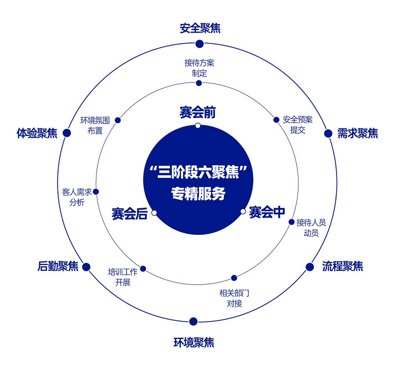 由保利商旅打造的“三階段六聚焦”專精服務(wù)模式,圍繞賽會前、中、后三大階段,做好安全聚焦、需求聚焦、流程聚焦、環(huán)境聚焦、后勤聚焦、體驗聚焦。在接待方案制定、安全預案提交、接待人員動員、相關(guān)部門對接、培訓工作開展、客人需求分析及環(huán)境氛圍布置七大方面,全方位保障重大任務(wù),力求實現(xiàn)“高峰會服”的專業(yè)、高效、安全、體貼。
