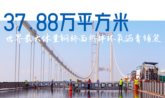 面對建筑史上規(guī)模最大的鋼橋面環(huán)氧鋪裝工程,保利長大自主研發(fā)智能建造系統(tǒng),開創(chuàng)業(yè)內(nèi)環(huán)氧瀝青鋪裝全環(huán)節(jié)自動化施工的先河,三次刷新單日熱拌環(huán)氧瀝青鋼橋面鋪裝施工面積的世界紀錄。